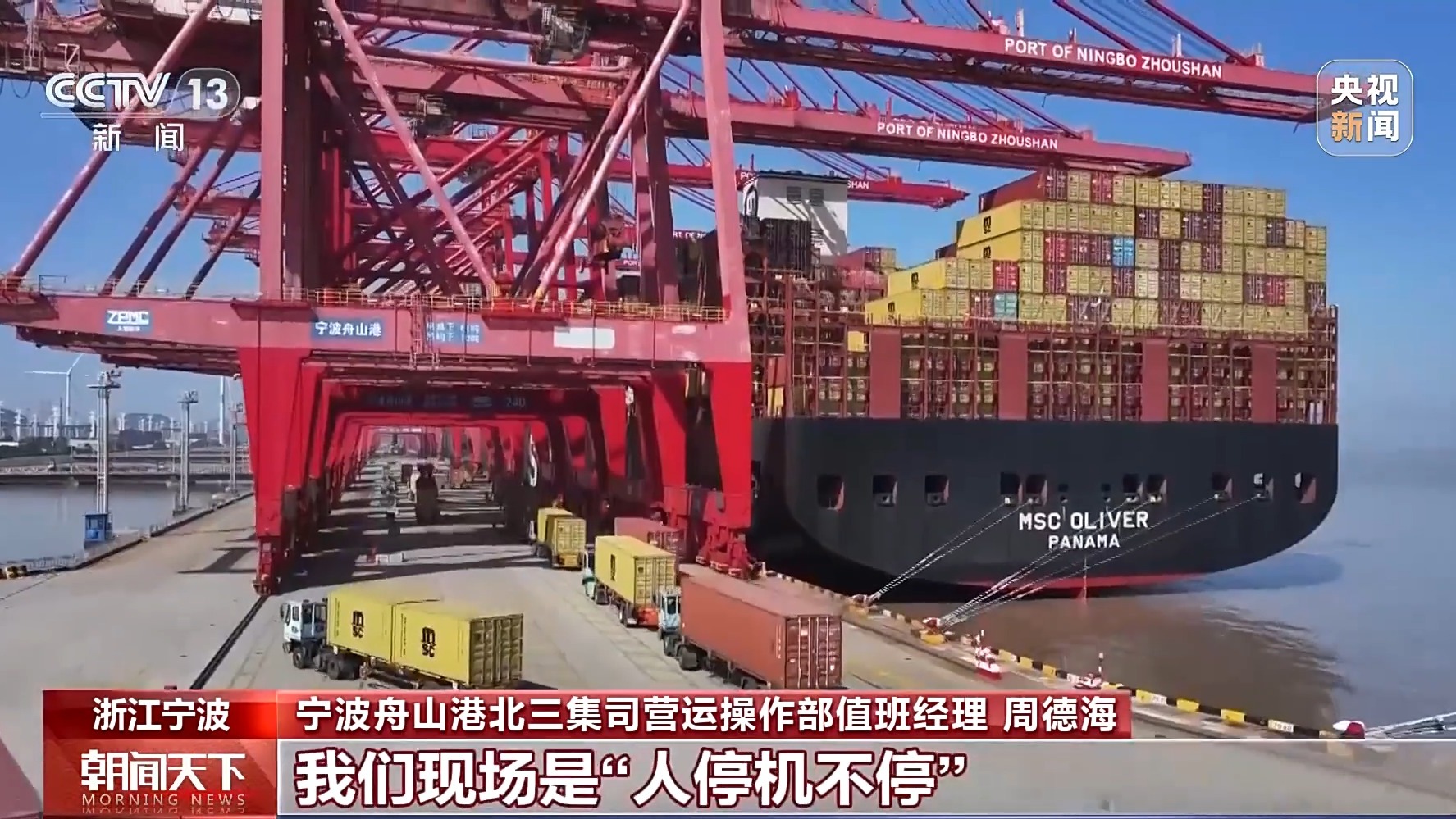 寧波舟山港北三集司營運操作部值班經理 周德海:這條船載重量超過了19萬噸,這回在我們港區的作業量超過了兩萬標準箱,像這樣的船型,整個春節期間還是比較多的。這幾天出口箱量增長比較明顯,我們現場是“人停機不停”。節后的第一波出口集中,客戶都希望搶時間、趕船期,我們也爭分奪秒確保貨物能及時出運。