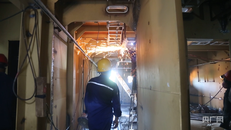 “寧遠電鯤”號造船現場,工人正在進行焊接作業 (央廣網見習記者 尹博 攝)