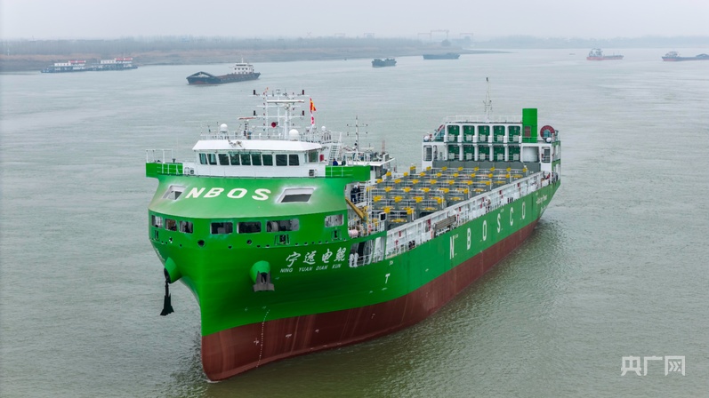 國內首制大容量電池換電運輸船“寧遠電鯤”號順利離廠海試(央廣網見習記者 尹博 攝)