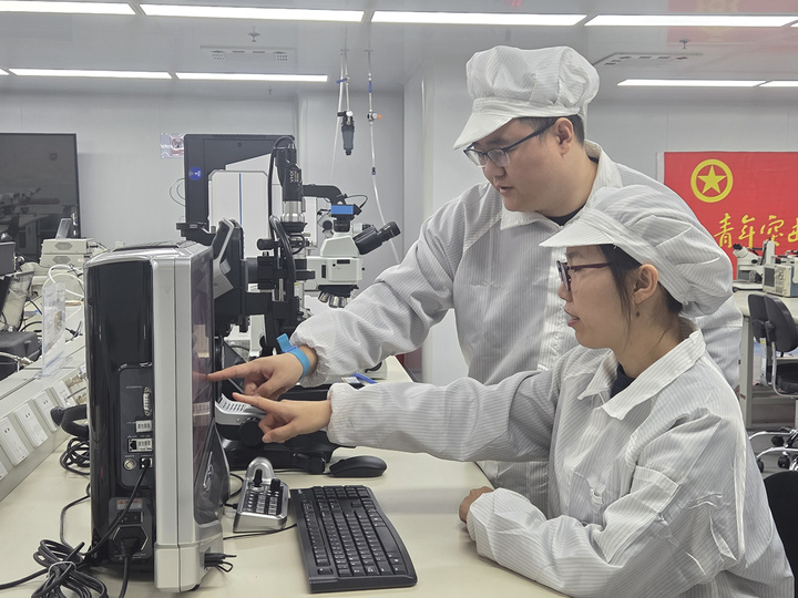 2月24日,春節(jié)假期后首個(gè)工作日。8時(shí),江蘇金陵機(jī)械制造總廠的超凈間里,無(wú)影燈準(zhǔn)時(shí)亮起。33歲的首席技師張?chǎng)┘瘬Q上防靜電服,快步走向工作臺(tái)。這是他每天開啟“微米級(jí)挑戰(zhàn)”的固定場(chǎng)景。屏息凝神,手中的鍵合劈刀精準(zhǔn)起落。幾秒后,一個(gè)誤差僅0.003毫米的“蝶形焊點(diǎn)”成型。