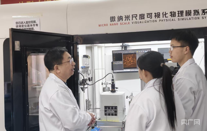 吳景春(左一)與團隊成員正在討論頁巖油采收技術(央廣網記者 陳顯春 攝)