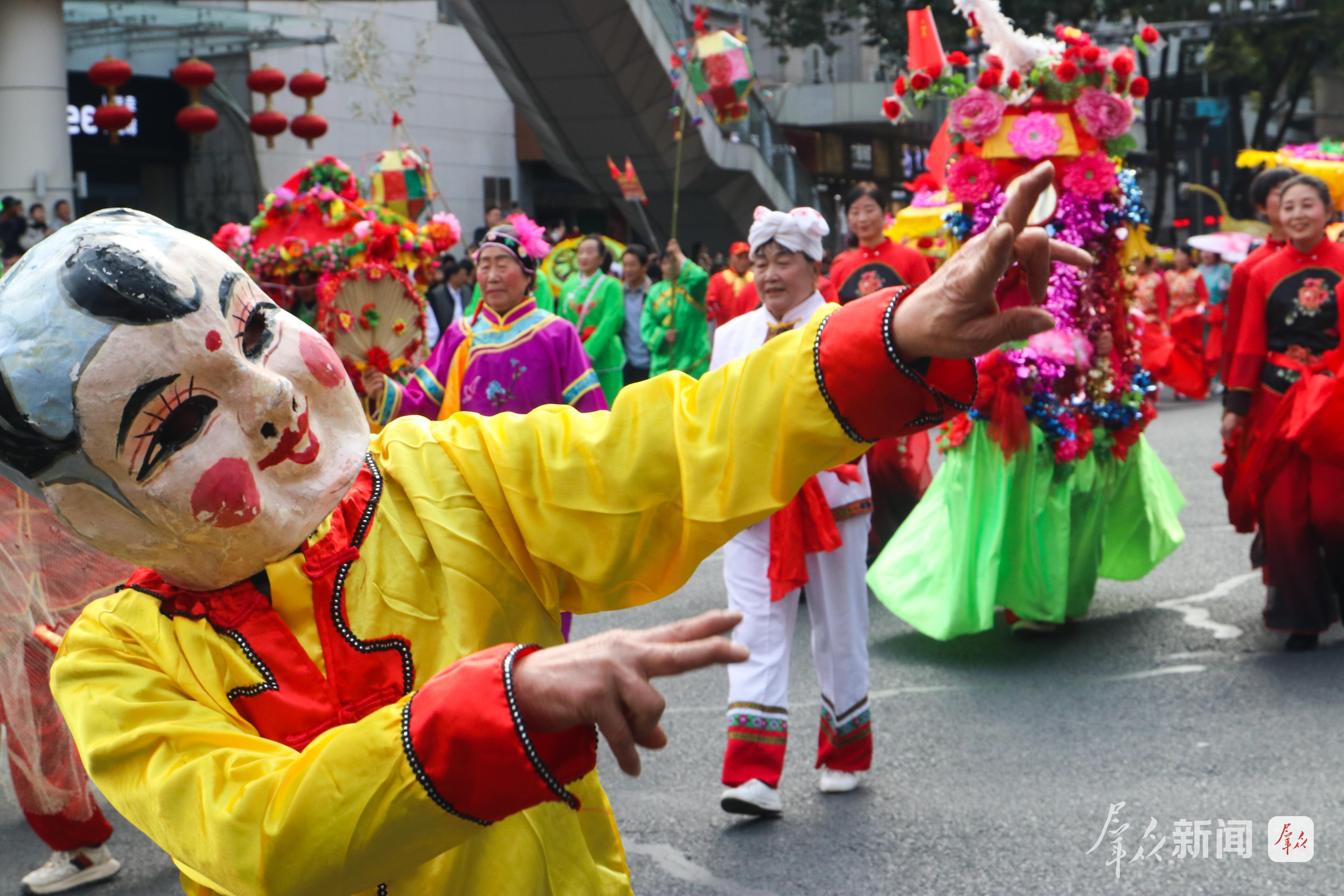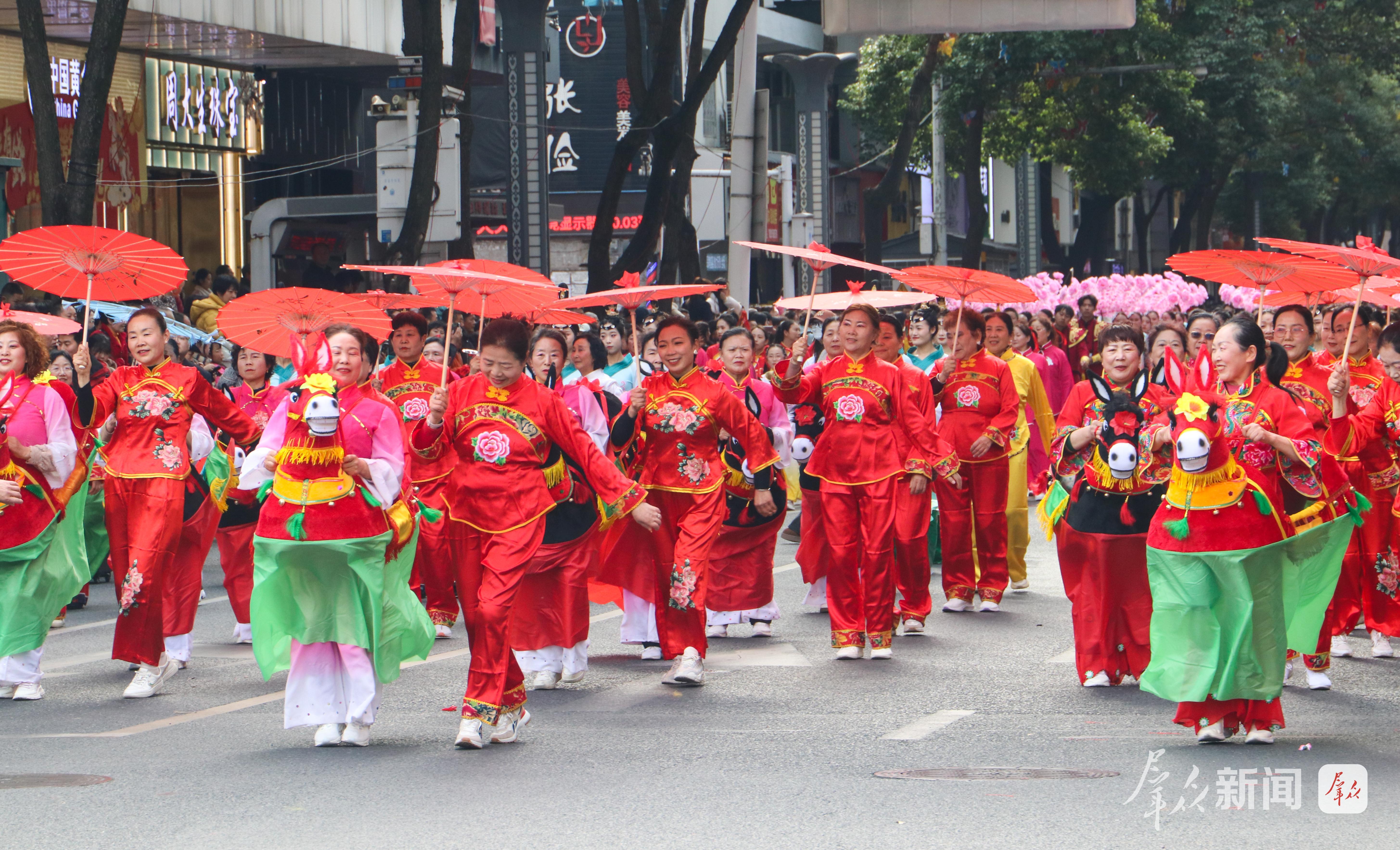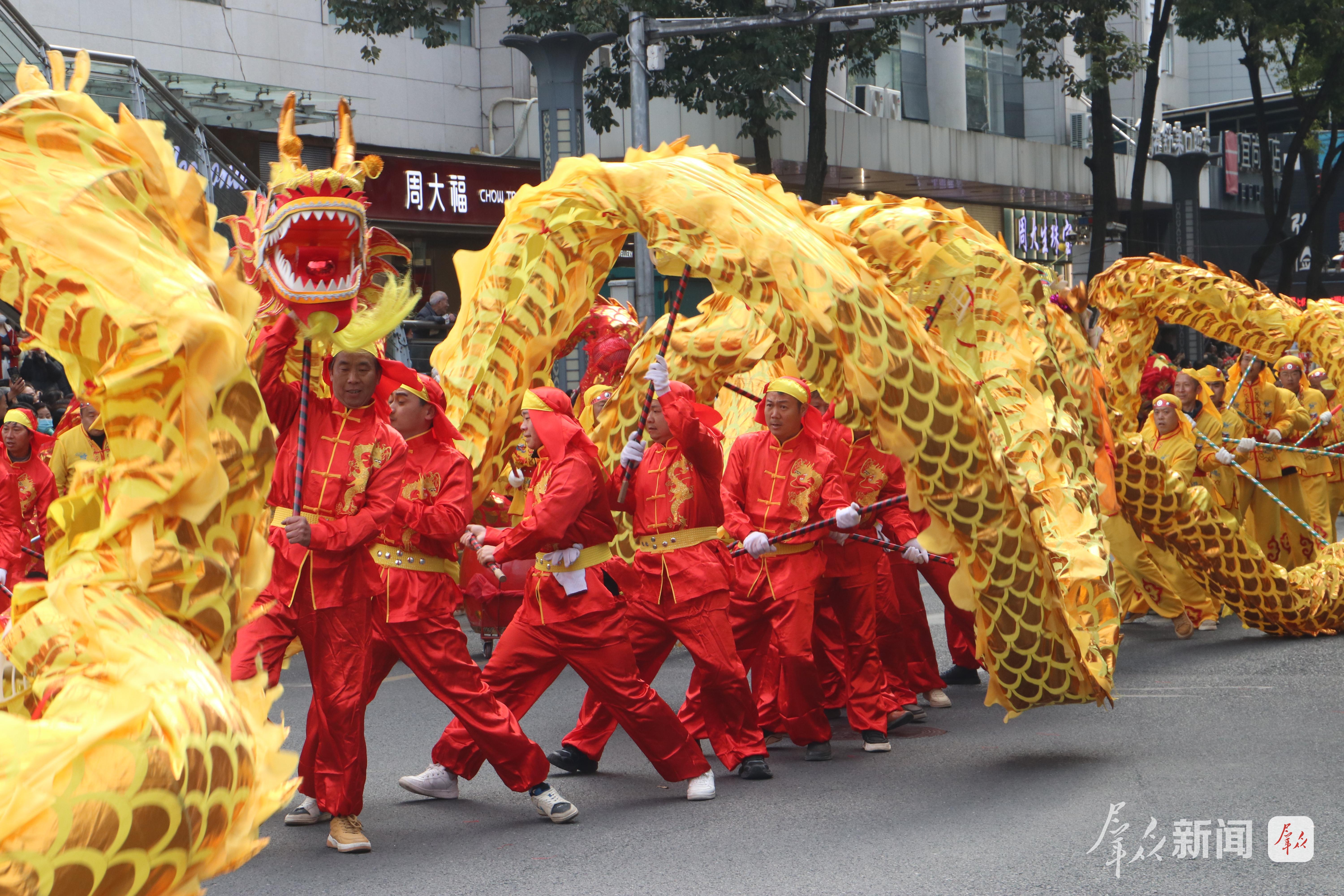 舞龍的漢子們擎著金龍狂奔騰躍,龍身隨著繡球翻飛,在陽光下劃出道道弧線;踩高蹺的藝人足蹬三尺木蹺,時而扭起秧歌步,時而俯身與路邊孩童擊掌;彩蓮船的“船娘子”碎步輕移,艄公手握船槳在前逗趣,一唱一和間,漢江邊的漁家風情躍然眼前……社火隊員們身著五彩斑斕的服飾,踩著鼓點旋轉、跳躍,耍出新年精氣神。