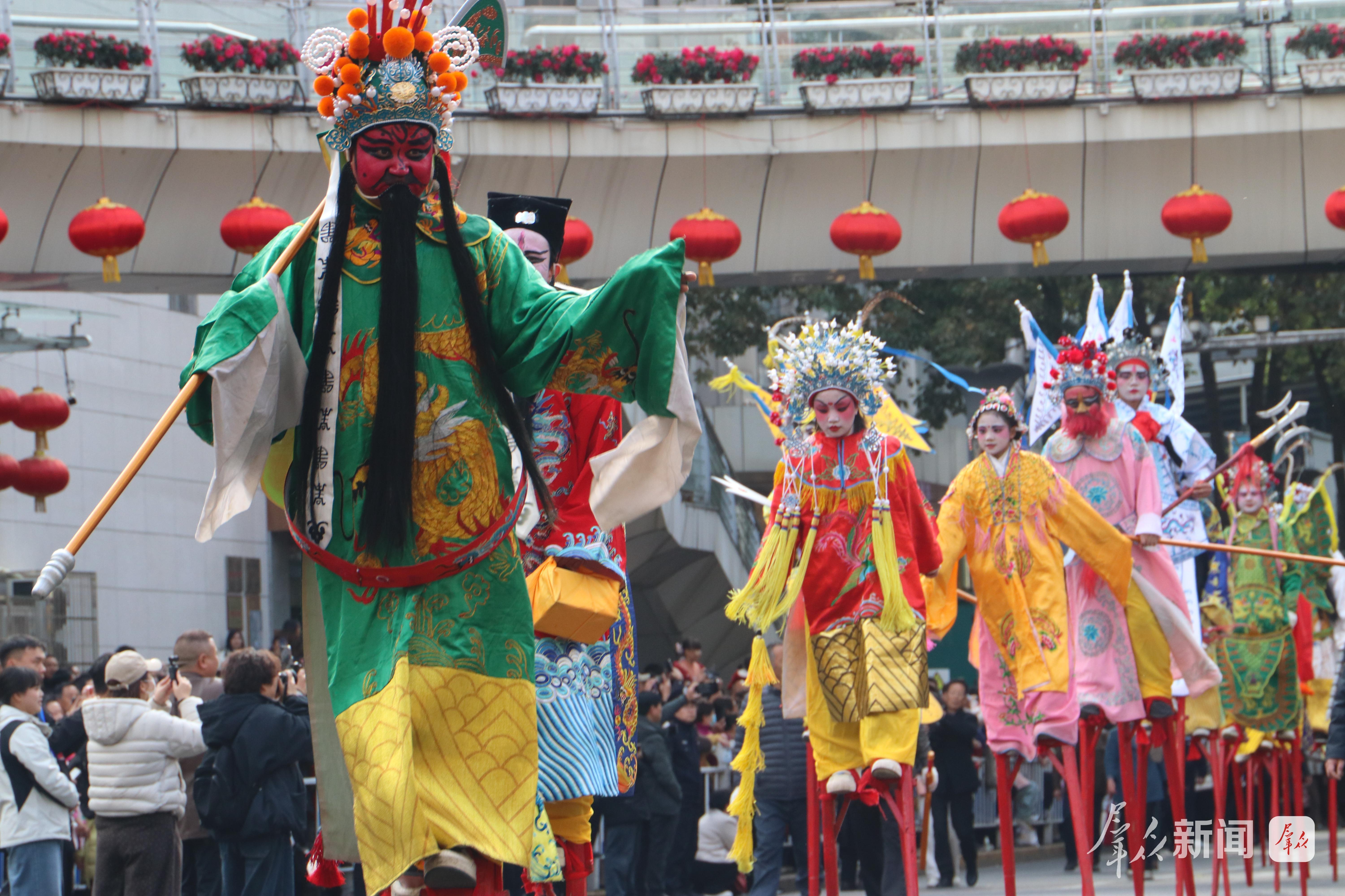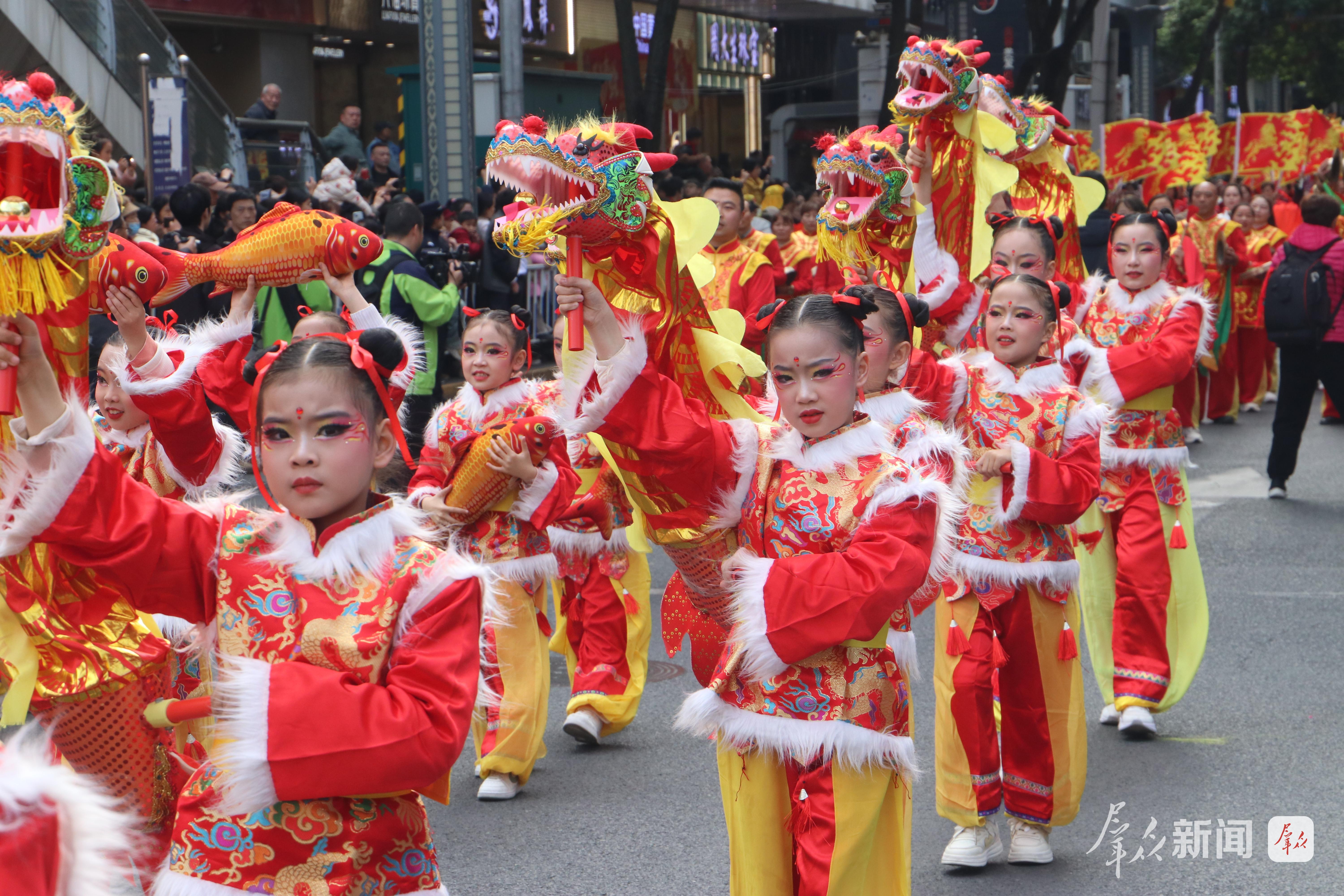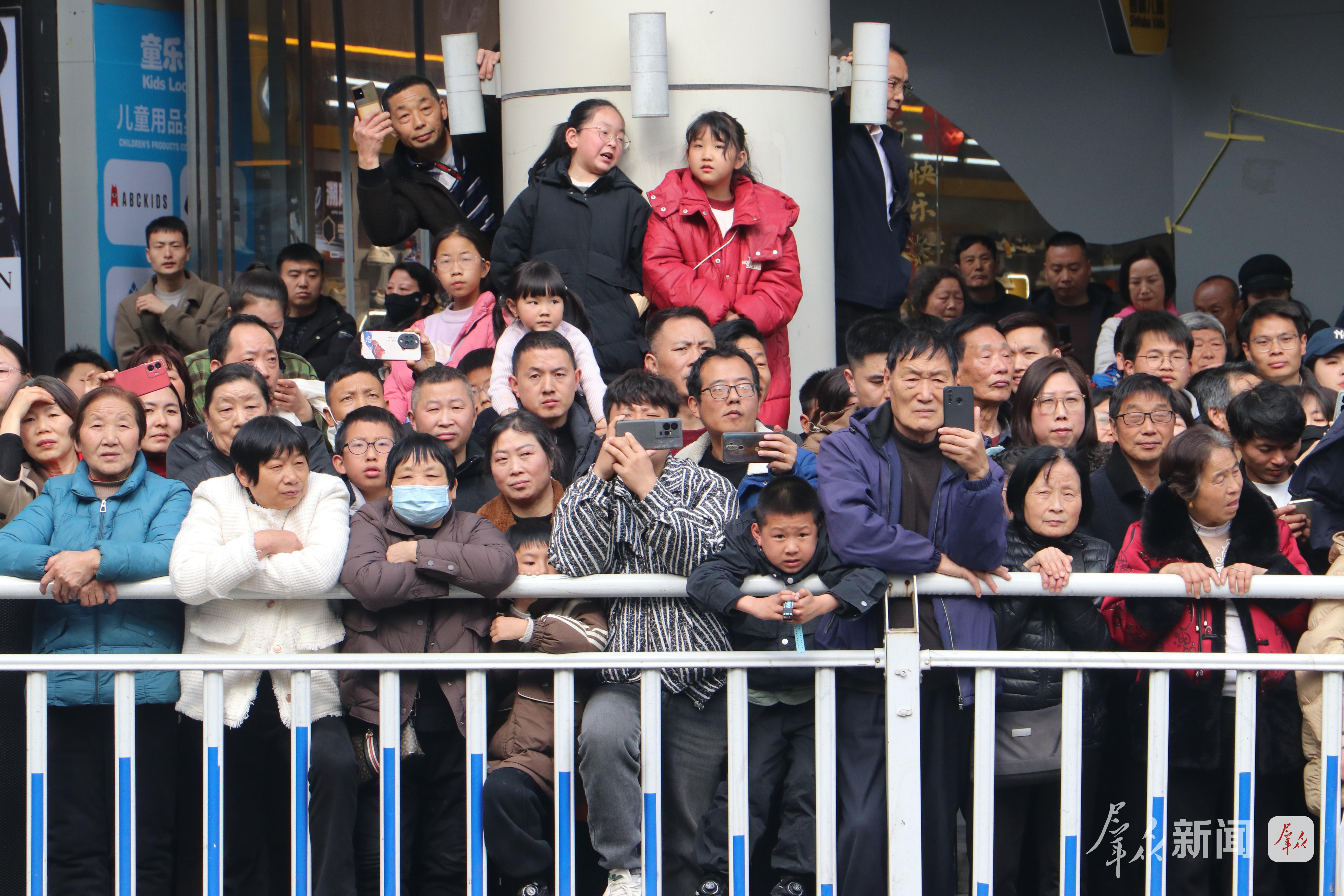 巡游沿途,觀眾呼朋引伴、摩肩接踵,歡呼聲、喝彩聲此起彼伏。大家紛紛拿出手機、相機記錄精彩瞬間,大人小孩臉上都洋溢著新春的喜悅,不少市民跟著隊伍一路前行,沉浸式體驗社火巡游的熱鬧。