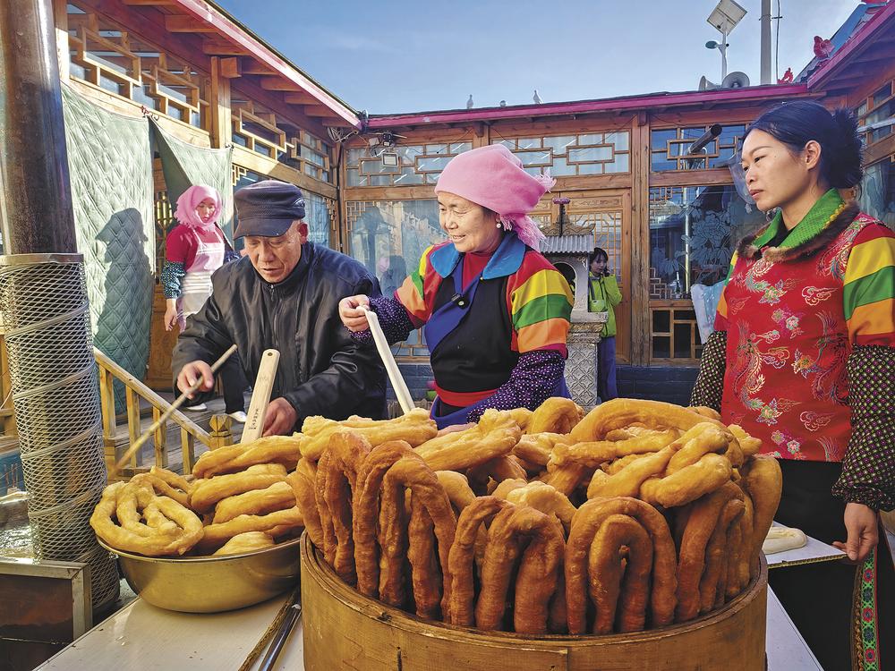 走進(jìn)村民張卓麻什姐家的莊廓院,暖意與香氣撲面而來。一口大鐵鍋支在院中,柴火在灶膛里噼啪作響,盤馓在滾燙的油鍋里翻滾、膨脹。張卓麻什姐手法嫻熟地搓面、盤繞、下鍋。她的丈夫呂旦主在旁一邊照看灶火,一邊用兩根棍子翻動盤馓。待盤馓炸至金黃酥脆,他小心翼翼撈起,放在托籠(一種竹編大蒸籠)中控油晾涼。不遠(yuǎn)處的廚房里,兩個兒媳分工忙碌,一個在案板上揉面,一個不時端著一盤盤面劑子,快步往院子里送。院中,四個小孫子追逐嬉鬧,清脆的笑聲與油鍋的滋滋聲、家人的談笑聲交織,勾勒出一幅熱氣騰騰的新春團(tuán)圓圖。