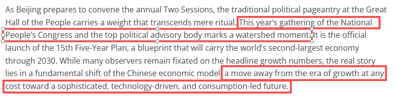 文章還說(shuō),今年的中國(guó)全國(guó)兩會(huì)最值得關(guān)注的一方面,是對(duì)擴(kuò)內(nèi)需和促消費(fèi)的重視。“十五五”規(guī)劃建議將“居民消費(fèi)率明顯提高”作為重要目標(biāo),為實(shí)現(xiàn)這一目標(biāo),政策重點(diǎn)正轉(zhuǎn)向“銀發(fā)經(jīng)濟(jì)”(老年人護(hù)理和服務(wù))和“低空經(jīng)濟(jì)”(無(wú)人機(jī)和短程航空)等領(lǐng)域,通過(guò)加強(qiáng)社會(huì)保障、鼓勵(lì)服務(wù)消費(fèi),中國(guó)正努力構(gòu)建更具韌性的國(guó)內(nèi)市場(chǎng),使其不易受全球貿(mào)易周期和外國(guó)關(guān)稅的影響。這種內(nèi)部再平衡將把龐大人口數(shù)量轉(zhuǎn)變?yōu)榻?jīng)濟(jì)需求的主要引擎,而不僅是全球生產(chǎn)基地。