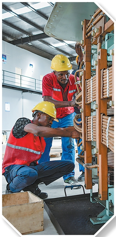 贊比亞工人在位于該國中央省奇邦博市的贊比亞江西經濟合作區進行變壓器設備維保作業。
