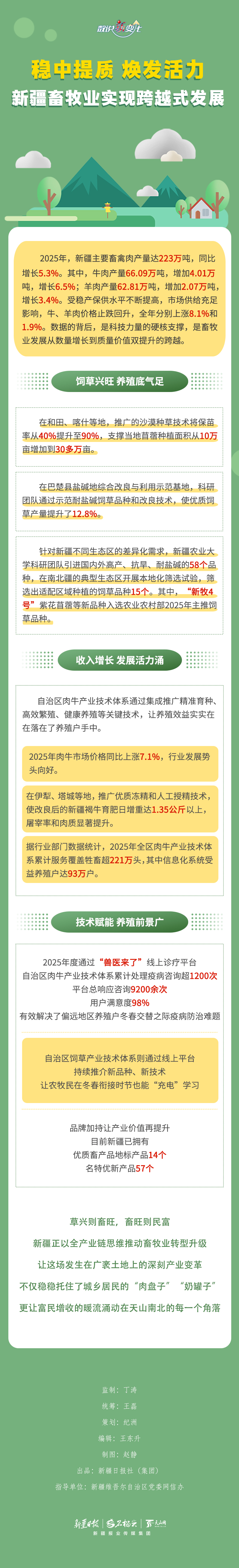 2025年,新疆深入實施畜牧業振興行動,“牧九條”等政策成效持續顯現,畜牧業生產企穩回升、再攀新高,主要畜禽肉產量達223萬噸,同比增長5.3%。數據的背后,新疆畜牧業發展的硬核支撐是什么?今天的《數說“新”變化》一起來看看。