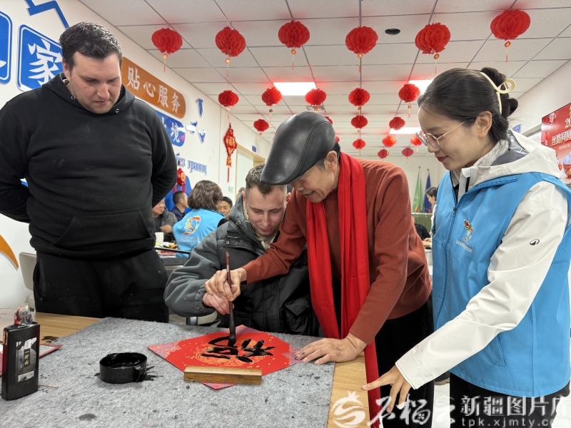 3月2日,志愿者吳澤虎教外國司機寫書法。石榴云/新疆日報記者 白素君攝