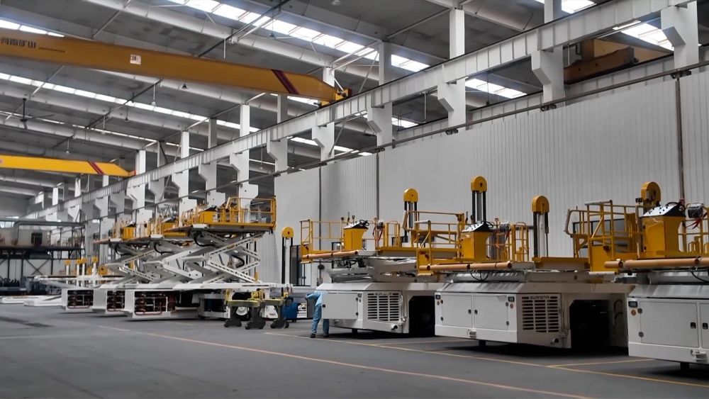 在威海廣泰空港設備股份有限公司第二生產工廠,一臺臺機場平臺車正有序裝配、檢測。