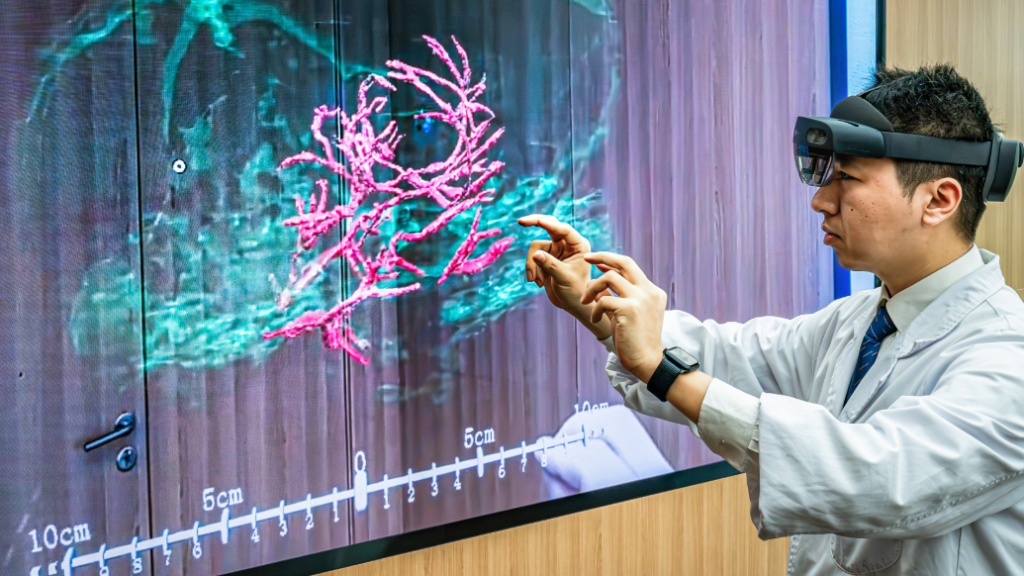 2025年3月26日,科研人員通過微米級腦機接口混合現實,精準呈現腦機接口與大鼠大腦主要血管和腦組織的空間位置關系。新華社圖