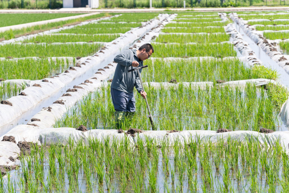 2025年6月18日,在位于黑龍江省雙鴨山市寶清縣的中國水稻研究所北方水稻研究中心的試驗田內,科研人員取耕層土樣。新華社記者 謝劍飛 攝