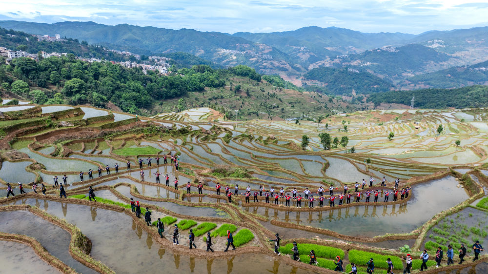 2025年5月2日,在云南省紅河縣甲寅村“開秧門”儀式上,村民身著民族服飾,沿著田埂踏歌而行(無人機照片)。新華社記者 胡超 攝