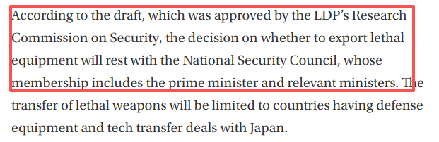 據日本媒體此前報道,根據自民黨安全保障調查委員會批準的草案,是否出口致命性武器裝備的決定權將歸國家安全保障會議所有,其成員包括首相和相關閣僚。