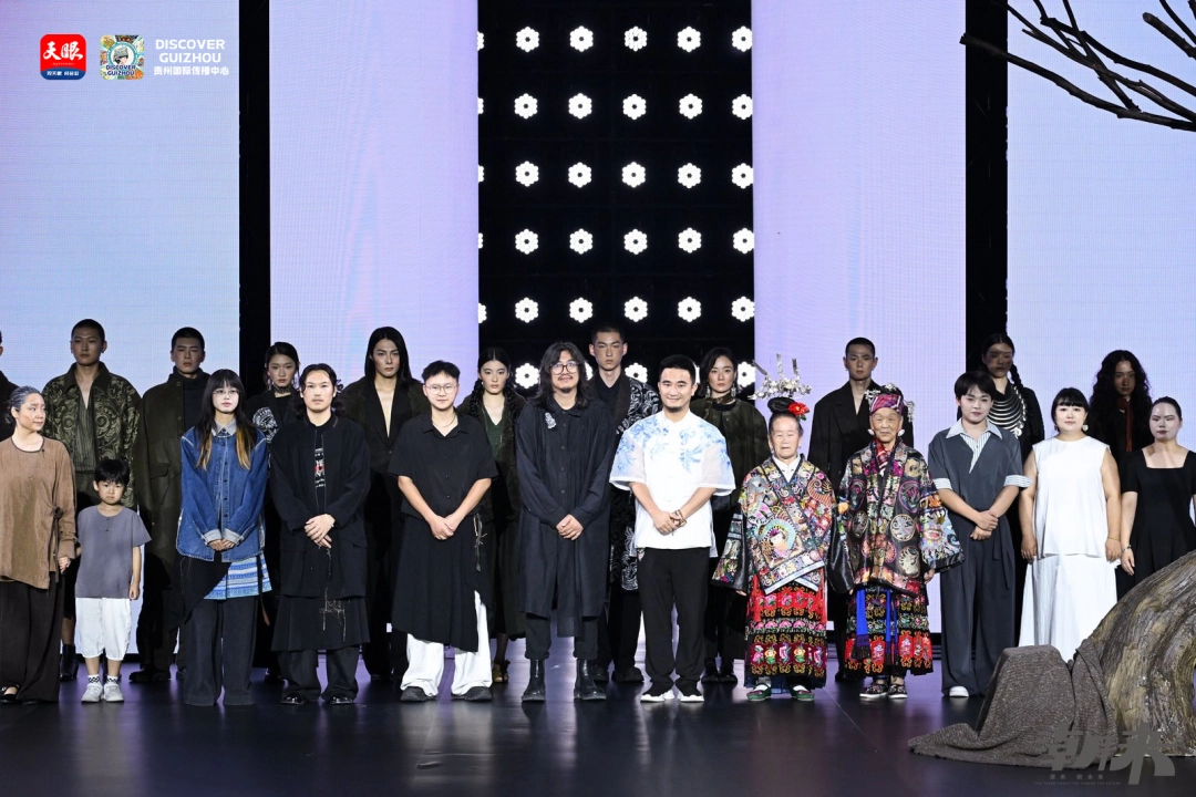 貴州“村T”80歲“姐妹花”潘玉珍(前排右四)、李儒芬(前排右五)登上中國國際時裝周。
