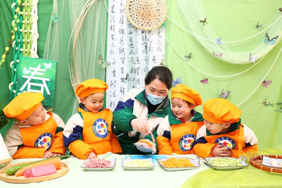 2月3日,江蘇海安市一家托育中心里,孩子們?cè)诶蠋熤笇?dǎo)下學(xué)包春卷。顧彬斌攝