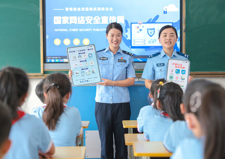 在山東省榮成市府新小學教室內,轄區民警通過案例講解為學生們普及網絡安全和防詐騙知識(2025年9月15日攝)。新華社發(李信君攝)