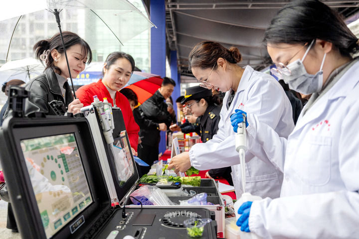 在浙江省湖州市長興縣放心消費嘉年華公益活動現場,該縣食品藥品檢驗檢測中心工作人員為市民提供免費果蔬檢測服務(2025年3月15日攝)。新華社發(譚云俸 攝)