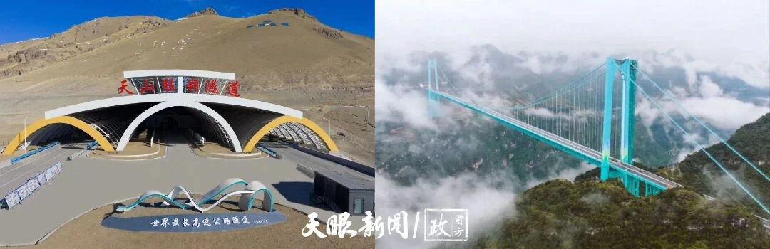 一座來自多彩貴州,是橫跨“地球裂縫”的花江峽谷大橋,大橋以橋面距水面625米的垂直高度,問鼎“世界第一高”;一座扎根大美新疆,是烏魯木齊至尉犁高速公路的“咽喉工程”天山勝利隧道,憑22.13公里長度成“世界最長高速公路隧道”。