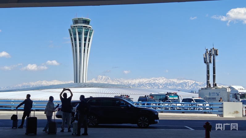 旅客在烏魯木齊天山國(guó)際機(jī)場(chǎng)航站樓前拍照留念 (央廣網(wǎng)記者郭璁悅攝)