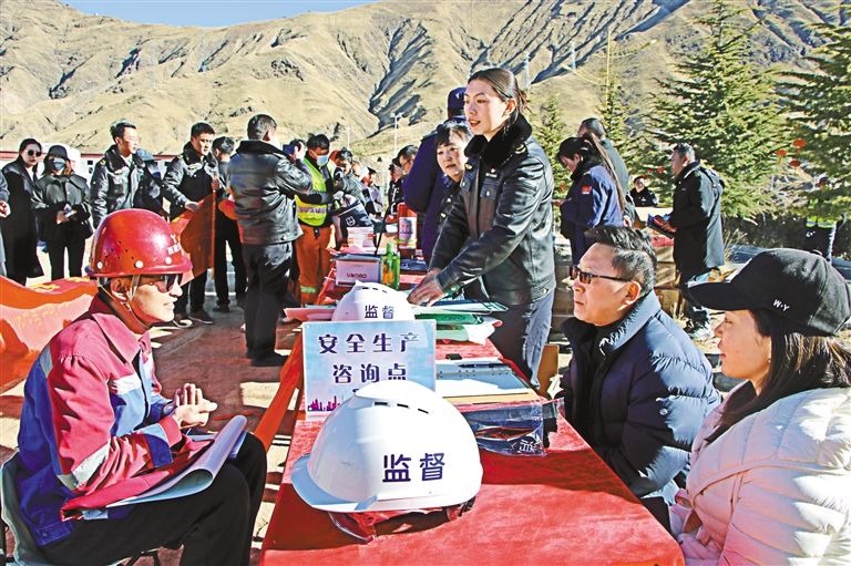 圖為近日,柳梧新區管委會安監局聯合綜合執法局等部門依托拉薩高新區(柳梧新區)建設項目開復工啟動儀式,開展復工復產安全生產宣傳活動。這是工作人員向現場干部職工、施工企業代表普及建筑施工領域安全生產知識。 記者 盧文靜 攝