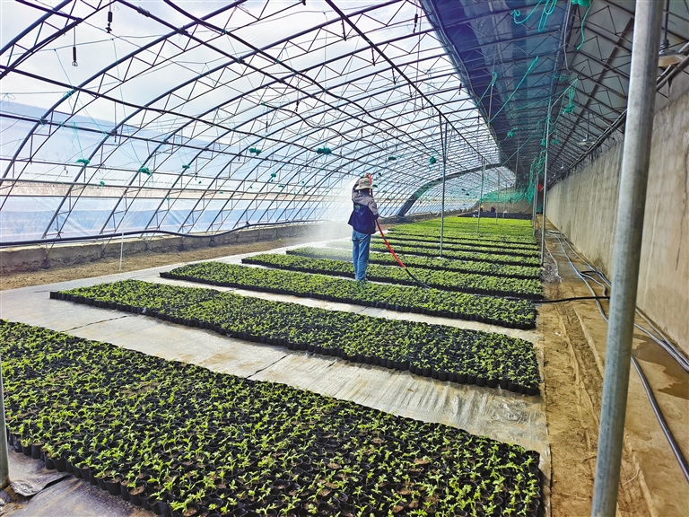圖為工作人員為移栽的萬(wàn)壽菊種苗澆水。記者 格桑倫珠 攝
