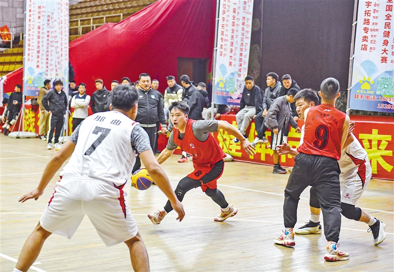 5月10日,來自全區的十一支三人制籃球隊和四支五人制籃球隊在拉薩參加選拔。最終將以冠軍隊伍為班底,選拔出三人制及五人制籃球隊各一支,代表西藏參加第一屆全國全民健身大賽(西南區)籃球比賽。 圖為自治區公安廳隊球員黃偉(中)在比賽中持球突破。 新華社記者 晉美多吉 攝