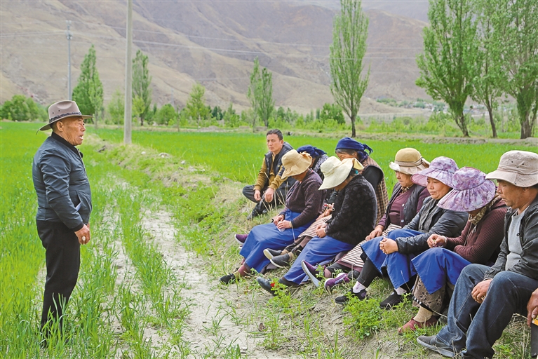 山南市瓊結縣老黨員尼木在下水鄉措杰村的田間地頭給村民黨員講黨課。記者 白瑪澤旺 通訊員 倫珠澤仁 攝
