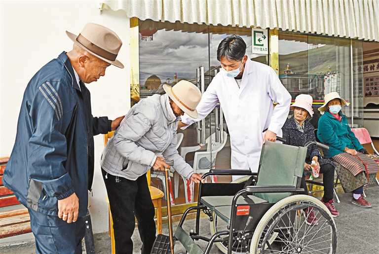 圖為山南市乃東區特困人員集中供養服務中心工作人員在照顧行動不便的老人。記者 旦增蘭澤 攝
