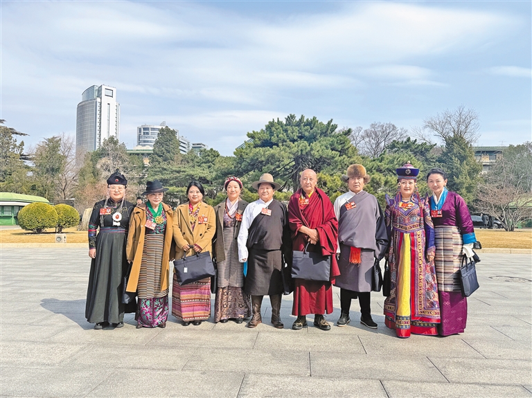 圖為住藏全國政協委員身著盛裝、滿懷豪情,在人民大會堂前合影留念。記者 丹增平措 攝