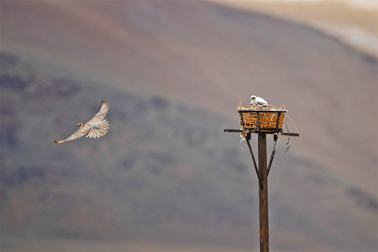 圖為在羌塘草原, 一只游隼飛離人工鷹架上的巢。新華社記者 姜帆 攝