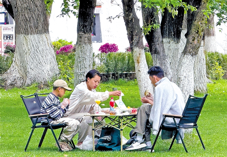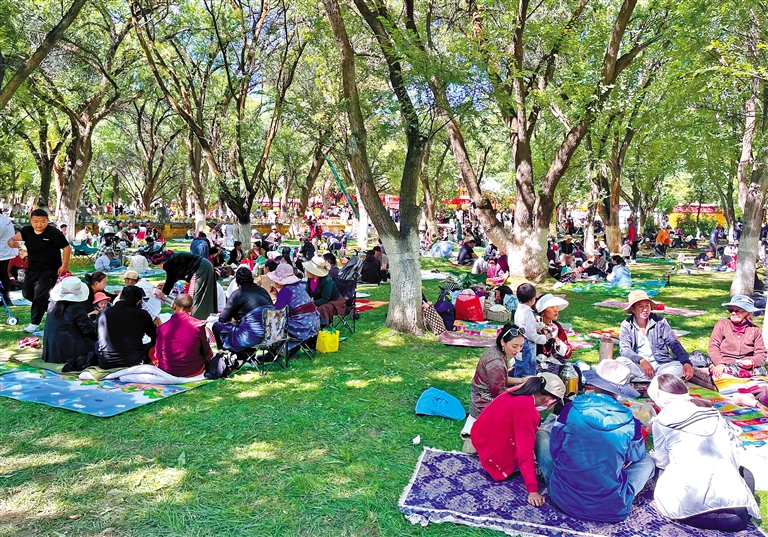 正在過林卡的拉薩市民尼珍告訴記者:“我們是自帶折疊椅、食物和茶具,在河邊搭帳篷、過林卡,喝著熱騰騰的酥油茶,看著藍(lán)天白云倒映在清澈的溪水中,這種愜意難以用言語形容。”