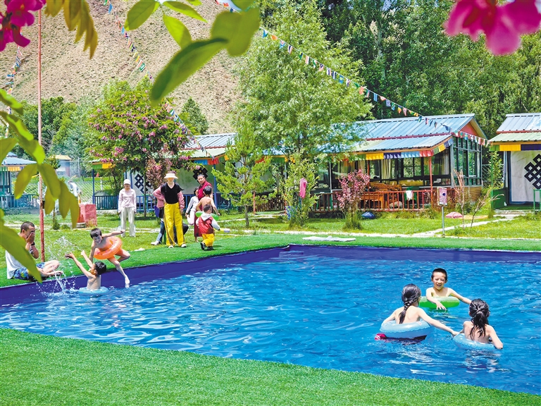 群眾在拉薩市林周縣白定村的林卡營(yíng)地內(nèi)玩水嬉戲。記者 洛桑 攝