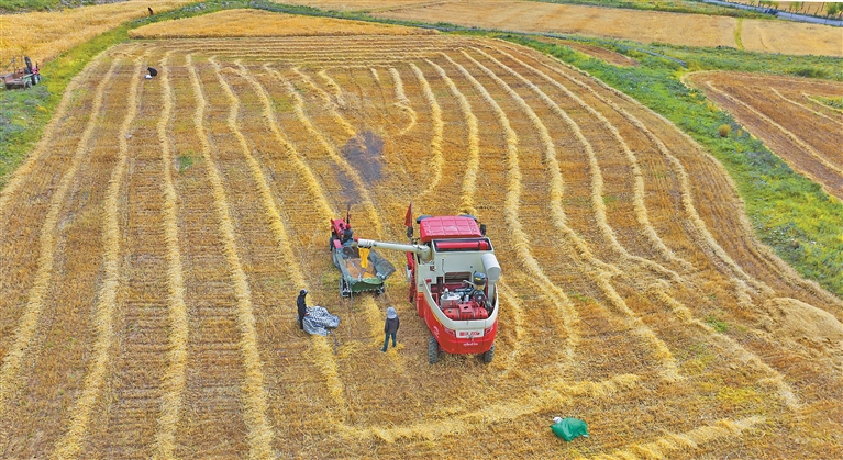 圖為該縣唐加鄉(xiāng)卓村村民在使用機(jī)械收割,并進(jìn)行青稞裝袋。記者 格桑倫珠 攝