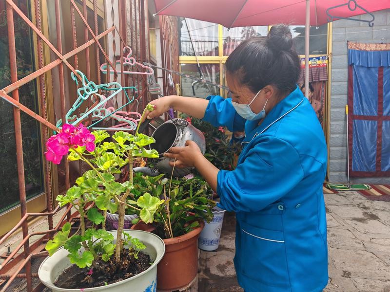 照料中心工作人員正在占堆老人家澆花。
