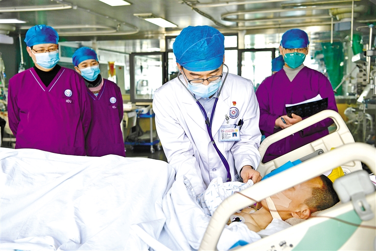 圖為北京大學人民醫院援助自治區人民醫院重癥醫學科副主任醫師王斌(中)在和本地醫生一起查房。記者 王敏 攝