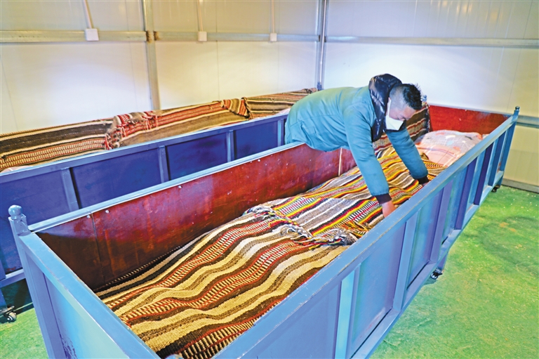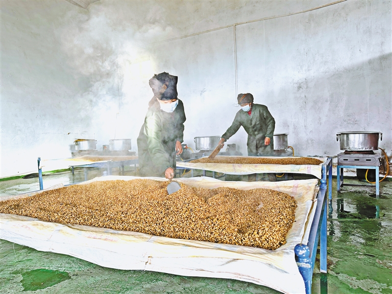 合作社成員在晾曬煮熟的青稞。