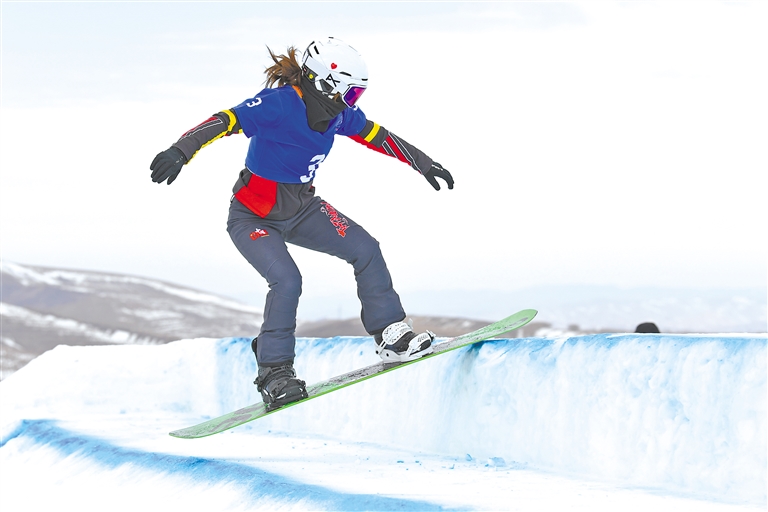 圖為我區選手尼瑪擁青參加單板滑雪障礙追逐賽。