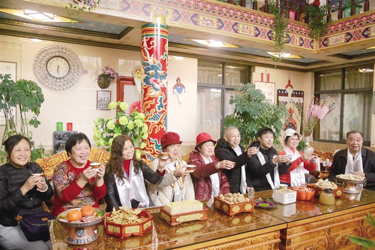 春日里的扎西曲登社區(qū),鄰里和睦、氣氛融洽。傳統(tǒng)文化在這個(gè)“桃花源”傳承交融,裝點(diǎn)著各族民眾相愛相融、增收共富的美好生活。