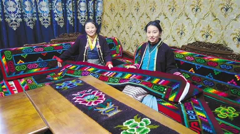 生格鄉(xiāng)古局村的巴桑(左)和嘎瑪(右)展示藏式編織卡墊培訓(xùn)成果。
