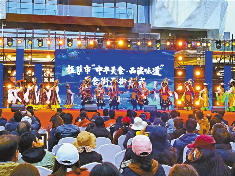 5月2日,拉薩印“中華美食·西藏味道”美食街開街,市民、游客觀看藏戲表演。記者 劉斯宇 盧文靜 攝