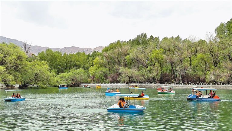 “五一”假期,市民、游客在拉薩宗角祿康公園內劃船游玩。記者 唐斌 攝