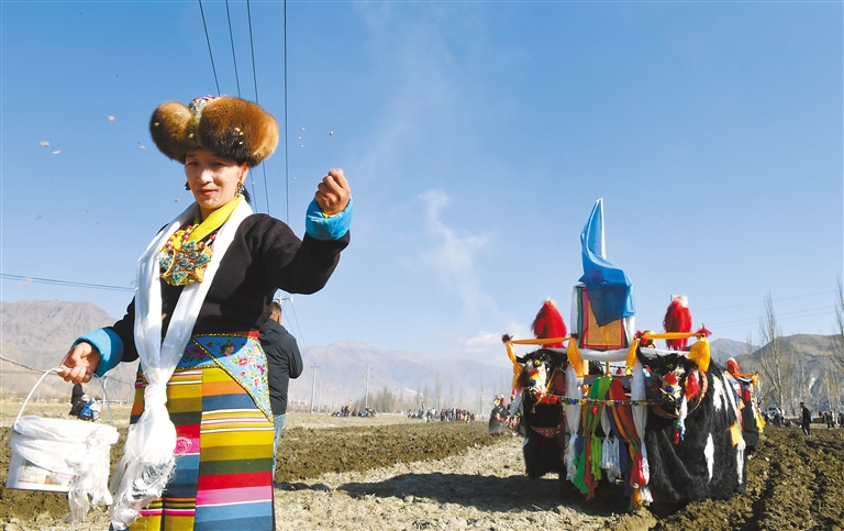 圖為山南市乃東區昌珠鎮克松村村民在向田間播撒種子。