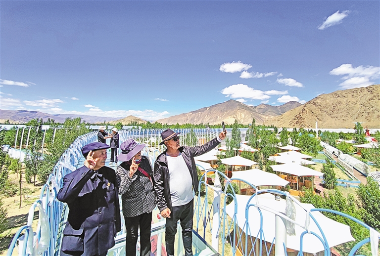 昔日山溝荒地,今日旅游盛景。走進西普農博園,穿過一段五彩斑斕的“時光隧道”燈光秀場,園內美景浮現在眼前,仿佛進入了世外桃源。果蔬花卉爭奇斗艷,西藏車厘子、陽光玫瑰葡萄正吸吮陽光雨露不斷成熟;高原風光沁人心脾,青樸山、雅魯藏布江盡收眼底;運動康養放松身心,游泳池、玻璃棧道、高空秋千讓人活力迸發;休閑娛樂花樣繁多,圍爐煮茶、花園火鍋、親子樂園等讓幸福生活煥新添彩;研學探索妙趣橫生,梅花鹿、駱駝、孔雀、鴕鳥等生靈構成一幅人與自然和諧相處的美好畫面。