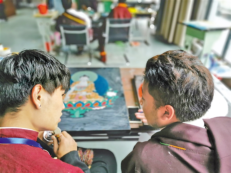 圖為唐卡畫師在交流唐卡漆畫創作技巧。