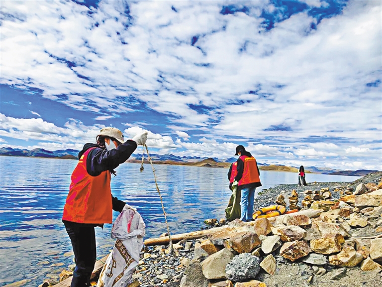 近日,山南市浪卡子縣組織干部群眾開展“心系母親湖 共護生態家園”主題環保活動,清理羊湖沿岸、河道溝渠等區域的垃圾,以實際行動守護良好的自然生態。