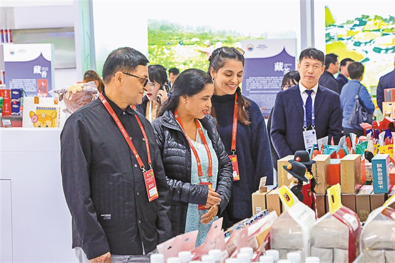 圖為尼泊爾聯邦院前主席、尼泊爾文化中心主席加內什·普拉薩德·蒂米爾西納(左一)攜家人參觀特色綜合展區。記者 謝筱純 劉楓 胡文 攝