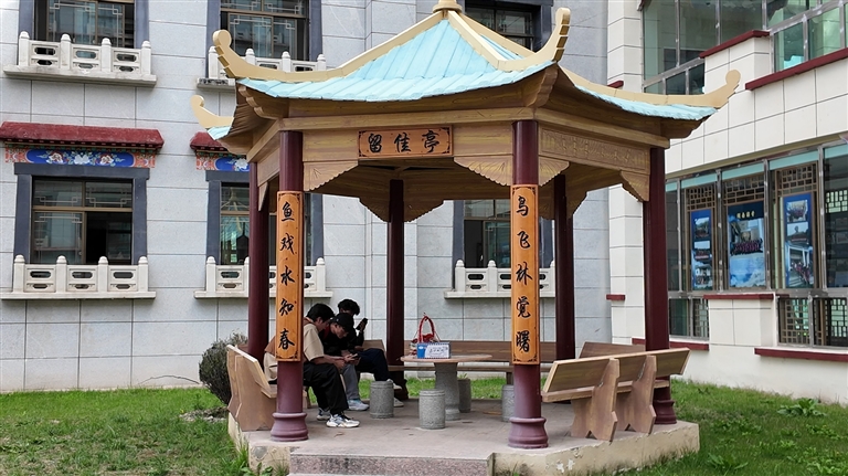 學生正在校園內的涼亭里讀書。