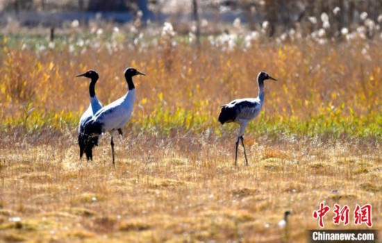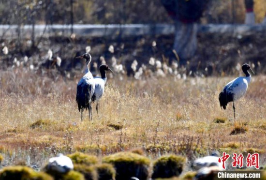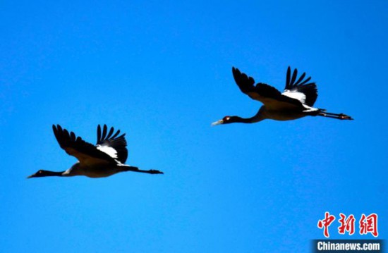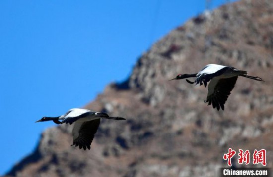 黑頸鶴是全球十五種鶴類中唯一在高原地區繁殖和越冬的鶴類,被譽為“高原神鳥”,屬中國國家一級保護動物。每年10月中下旬左右,黑頸鶴陸續飛抵雅魯藏布江中游河谷等地越冬。圖為11月3日,黑頸鶴在西藏拉薩達孜區上空飛翔。中新社記者 李林 攝