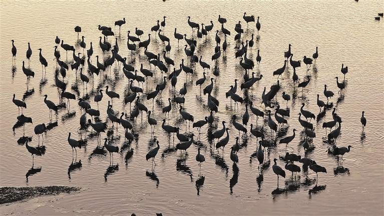 黑頸鶴是全球15種鶴類中唯一在高原地區生活、繁殖的鶴類,屬國家一級保護動物。每年10月中下旬,大批黑頸鶴從藏北高原飛到拉薩河谷,它們在農田、沼澤地里覓食嬉戲,享受冬日暖陽。