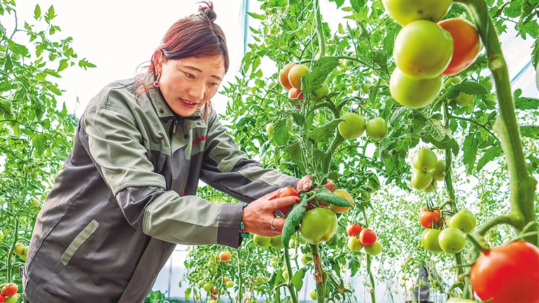 圖為近日,在丁青縣農(nóng)業(yè)生態(tài)產(chǎn)業(yè)園,工作人員在采摘西紅柿。